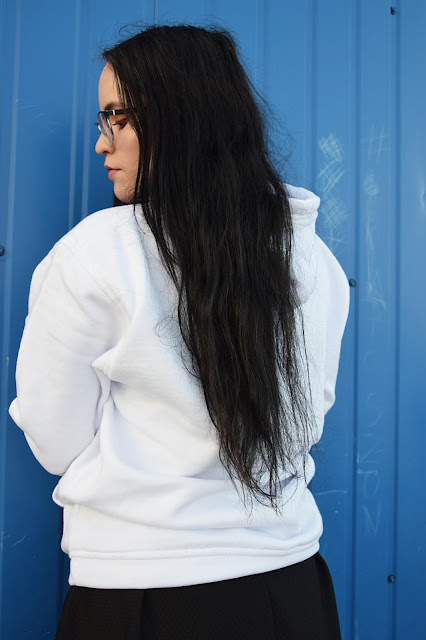 Głównym elementem w moim outficie jest oczywiście biała bluza z kapturem. Zestawienie te uzupełniłam o czarną spódnicę, kurtkę, długie kozaki, czapkę oraz torebkę. Tym sposobem stworzyłam stylizację sportową utrzymaną w czarno-białej kolorystyce. Jest ona dosyć uniwersalna, gdyż pasuje na wiele okazji - na co dzień, do szkoły, na uczelnię, do pracy, na randkę. Dodam jeszcze, że czas oczekiwania na bluzę wydłuża się ze względu na produkcję haftowanego napisu. Natomiast prezentuje się ona bardzo ładnie i widać, że został starannie wykonany.